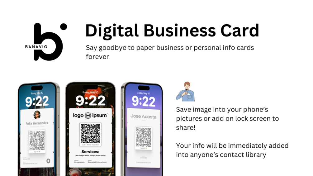 Stand out with Banavio’s custom-designed digital business cards. We tailor each card to your unique style, from colors and fonts to logos and special features. Your custom card will be a perfect reflection of your brand, easily shared and instantly added to contacts with a simple QR code scan. Elevate your networking with a card as distinctive as you are.